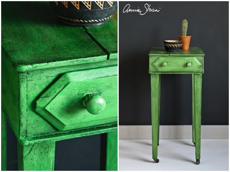 このサイドテーブルは、アニーがアンティーブグリーンのチョークペイント®︎でペイントしました。チョークペイント®︎が乾いたら、まずチョークペイント®︎クリアワックスを塗り、最後にチョークペイント®︎ブラックワックスでビンテージ風に仕上げました。クリアワックスを先に塗ることで、下のアンティーブグリーンを汚すことなく、ブラックワックスの深さをコントロールしやすくなります。ブラックワックスを塗った後は、クリアワックスを使って、ブラックワックスをぼかしたり取り除いたりすることができます。