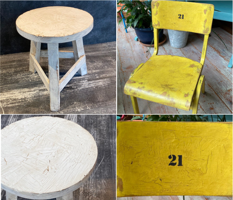 塗装したペイントが経年劣化してひび割れた状態を意図的に表現できるのがチョークペイントです。塗りたてのチョークペイントをヘアードライヤーを使って急激に乾燥させチョークペイントに亀裂を入れ、その亀裂にチョークペイント ワックスをすり込み亀裂を強調することで何十年も経過したかのようにエージング加工が簡単に特別な溶剤なしにできてしまいます。