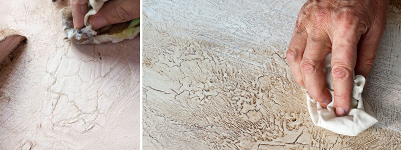 - 亀裂の強調だけで汚しをあまり入れたくない場合はクリアーワックスを使って拭き取ります。ただ、ワックスが乾燥後は拭き取ることができなくなります。