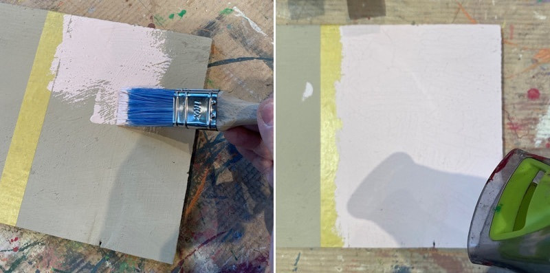 - 左側の楕円形ブラシによるひび割れは厚みのあるダイナミックなひび割れができ、右側のフラットブラシによるひび割れは均一な一定の塗膜厚のひび割れになります。