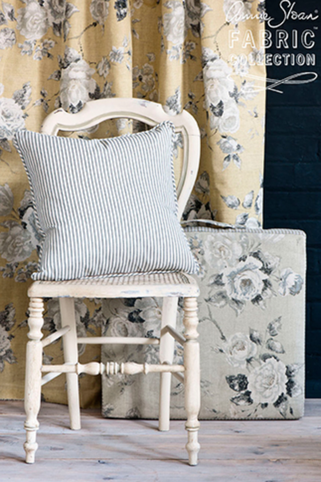 モナコはアニースローンファブリックコレクションの中で美しいティッキングの一つです。デニムブルー、チェスナットブラウン、赤ワイン、オートミール、ホワイト、グレー、セージブルーといった様々な色のストライプを組み合わせて出来ています。明るすぎず強すぎない色なので、このファブリックはどんな色の組み合わせにも合います。