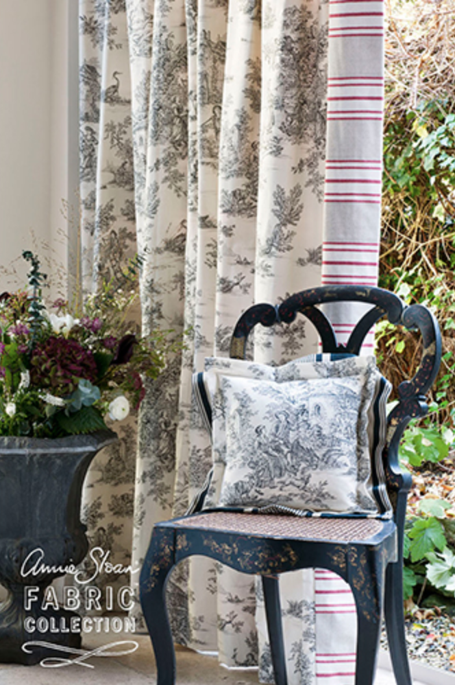 チャーコールパストラーレはアニースローンファブリックコレクションの2つのトワルの内の1つです。のどかなカントリーの風合いがオフホワイト100%ピュアコットンにグラファイトでチャーコールが描かれています。